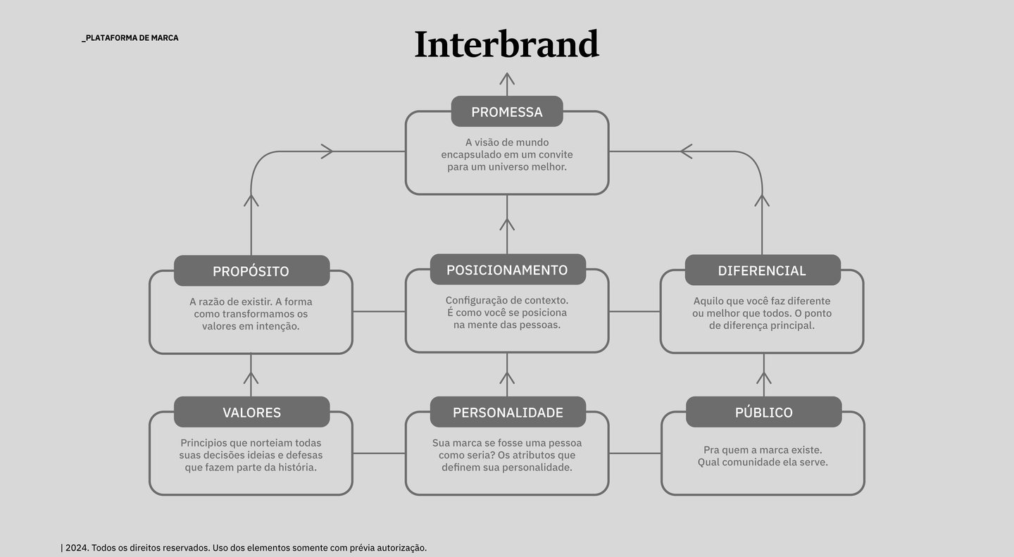 Um dos principais elementos contidos no serviço de branding concept é o Interbrand, que visa estruturar de maneira clara e coesa o propósito da marca, seus valores, promessas, diferenciais, público-alvo, e sua personalidade.